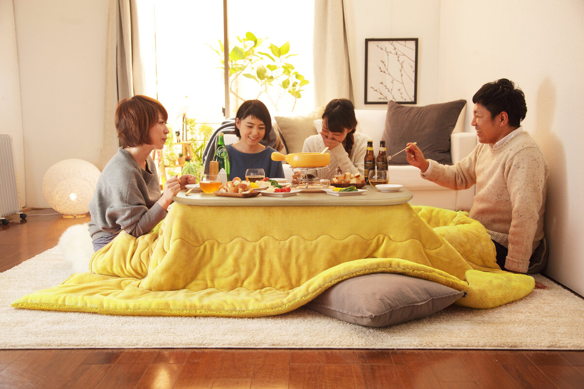 В самой холодной части страны есть центральное отопление, а жители других регионов греются своими силами. При помощи кондиционеров и обогревателей всех видов. Помимо этого, они носят тёплые пижамы и используют электрические одеяла сверху обычных. Очень популярны у японцев электрические ковры, в которых можно регулировать температуру и площадь обогрева. В учебных заведения есть локальные точки для того, чтобы погреть руки.
