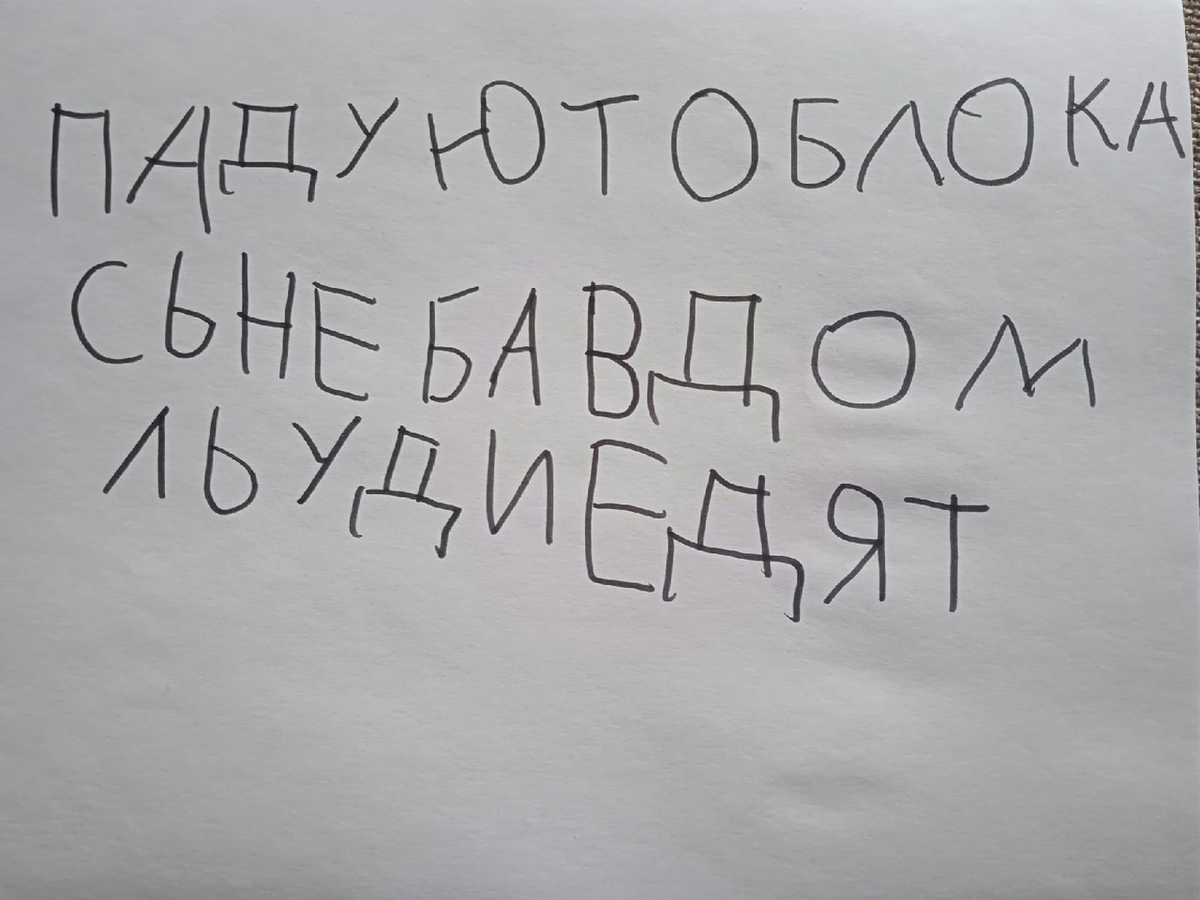 Всем привет. Я вчера на кухне - готовлю обед. Вдруг приходит дочка - такая вся загадочная и говорит: Я стихотворение написала. Разворачивает альбом и читает то, что сама написала. А потом показывает этот лист мне: Если исправить "авторское" написание, то получится глубочайшее хокку: Падают облака