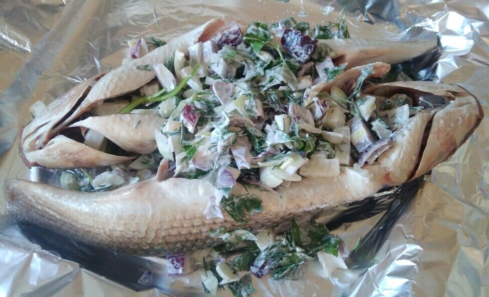 Рыбы Пеленгас запечённая в духовке с красным и белым репчатым луком. Ингредиенты: Две рыбины Пеленгас 2 луковицы белого репчатого лука 1 луковица красного репчатого лука Петрушка Укроп Соль Перец Майонез Способ приготовления: Рыбу берём не разделанную и с головой, цельную. Занимаемся рыбой. Рыба, конечно, будет в замороженном виде. Вам необходимо дать ей хорошо разморозится, чтобы вы смогли спокойно её разделать и подготовить к приготовлению. Полежав некоторое время рыбка разморозилась. Первым делом, необходимо срезать все плавники. Срезаем их ножницами. Далее преступаем к чистке чешуи. Чистит рыбу каждый по-своему. Конечно, удобно от хвоста и постепенно до головы счищать чешую. Так же не забудьте почистить и голову от чешуи, там она тоже имеется. Вычищайте чешую полностью, потому что кожу у рыбины тоже можно кушать, и она будет вкусной. Если не дочистите чешую, просто будете потом кушать вместе с ней. Итак, вы всё очень хорошо почистили. Приступаем к разделке. Берём нож, от середи