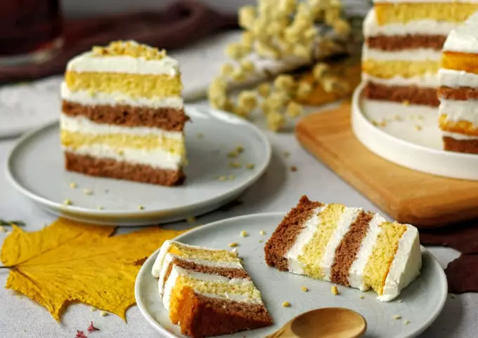 - Кладем темный корж, затем 150 г крема, затем светлый корж, еще 150 г крема и т.д.Убираем торт в холодильник на 2-3 часа.