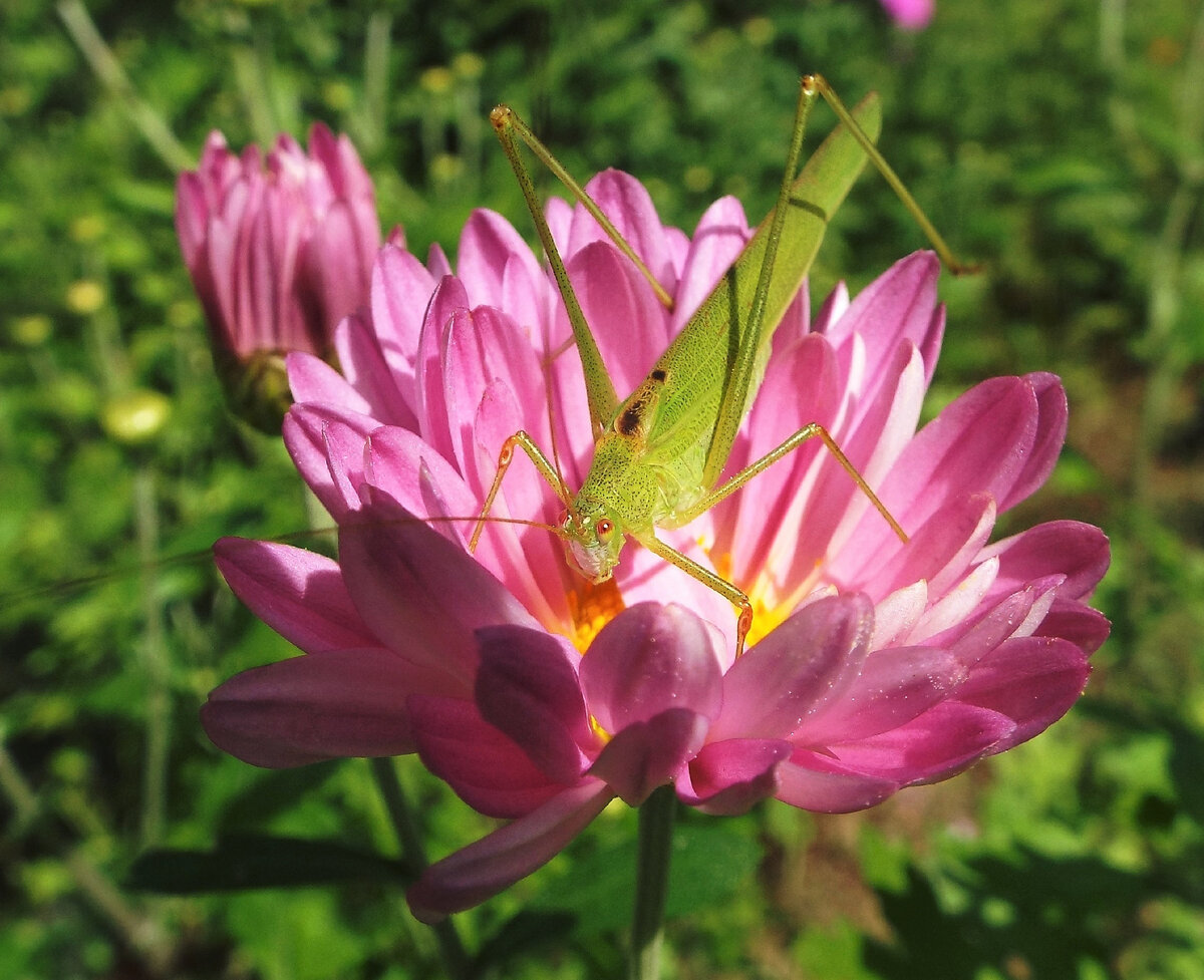 Летом 2020 года часто стали замечать у нас в Тверской области на садовых видах цветов кузнечиков с усиками, которые длиннее самого тела насекомого. До этого, может, конечно, не обращали внимания, но в этот сезон это как-то особенно бросилось в глаза. Насекомых можно было заметить почти на всех цветочных видах, а вот сфотографировать удалось не на многих. Кузнечики быстро перепрыгивают при виде "опасности". Видимых повреждений на растениях после их присутствия отметить я не могу. Классифицировать по видам или отрядам кузнечиковых я, конечно, не буду, так как не сильна в этом и могу ошибиться. Но заинтересовал вопрос: больше вреда или пользы в саду? Почитав об этих насекомых в интернете можно сделать вывод: кузнечики питаются другими более мелкими насекомыми, личинками, могут уничтожать и "собратьев", так же питаются и растительной пищей: почки, листочки, цветочки и т.д. Получается, что кузнечик, в принципе полезное насекомое, но может нанести и определённый вред растениям. В отличии