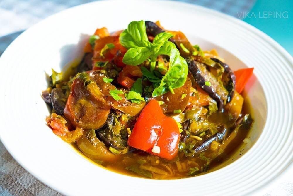 ПП Соте из баклажанов - ну очень вкусно! Итого на 100 грамм 70 ккал Б/Ж/У 3.4 / 3.9 / 5.7 Ингредиенты: Пару баклажан; 1 луковицу; Одну крупную морковку; Пару ярких сладких перцем, Несколько томатов; Из приправ: соль, острый перец, Зелень базилика и укропа, Пару зубков чеснока Приготовление: 1. Баклажаны помыть, удалить хвосты и нарезать крупными кубиками вместе с кожурой. Присыпать солью и оставить. 2. Перец и морковь тоже не мельчим, нарезаем соломкой, кубиками, колечками, да как угодно. Лук четверть кольцами. Грамульку острого перца. 3. Томаты пустить на сок с обилием мякоти просто натирая их на тёрке. 4. Протушить баклажаны на сухой сковороде и так-же остальные овощи. 5. Всё смешать и залить томатным соком. Томить на малом огне минут 20. После чего попробовать на соль и перец, подогнать по вкусу и, наконец, непосредственно перед тем, как снять блюдо с огня, заправить мелко рубленной зеленью и чесноком 6. Снять с огня, чуть прикрыть крышкой, оставляя зазор, чт