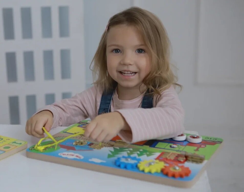 - Прищепки. Использовать их можно по-разному, к примеру, заготовить фигурку ежика из картона и попросить малыша прицепить к ней прищепки-иголки, приговаривая: «Как делает ежик?». Кроха в ответ четко произносит: «Фыр-фыр-фыр». Более полезная альтернатива – бизиборд. Расположенные на доске функциональные предметы можно хватать, крутить, открывать, при этом также проговаривая слова.
