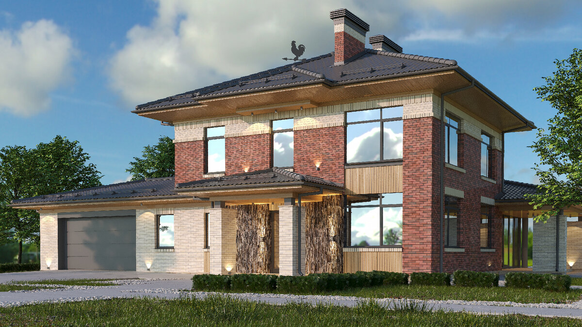 Проект дома с акцентом на большое панорамное остекление в придачу с современной активной архитектурой даёт самое лучшее решение для загородного дома. Для такого разнообразия помещений, 250 м2 не так уж и много, при этом лишнего ничего нет. На первом этаже основная идея - связка дома с гаражом и разделением на отдельные комнаты гостиной и кухни. Выход на террасу предусматривается из кухни. А на втором этаже активно применяются приемы размещения гардеробных и ванных при спальных комнатах. По отделке фасадов применяются 2 вида облицовочного кирпича, контрастных друг другу - бордо и слоновая кость. Лишь входная группа подчеркнута декоративным камнем. Широкие карнизные свесы крыши смотрятся стильно и одновременно защищают кирпичную кладку от дождя, а окна от пыли. Форма крыши в приоритете - вальмовая. Особую роль играет экстерьерная подсветка. По фасадам разложен каждый кирпичик в масштабе.