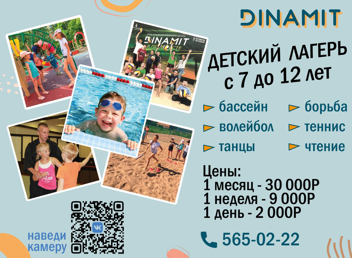 Лето уже не за горами, и это значит, что совсем скоро наш детский Летний лагерь откроет свои двери! ☀👧👦 Мы ждём всех ребят от 7 до 12 лет, чтобы вместе сделать это лето ярким, запоминающимся и мега спортивным!🏃♂🏃♀ В программе нашего Лагеря вас будут ждать: 💪 Ежедневные занятия спортом по самым разнообразным направлениям: игровые и пляжные виды спорта, бассейн, фитнес и даже единоборства. 📵 Никаких гаджетов, много живого общения, внеклассное чтение. 🙋 Разнообразные мастер-классы, развлечения, прогулки. 🍴 Трёхразовое вкусное питание. 👫 Новые знакомства и друзья, отличное настроение и куча позитивных эмоций. 📙Ежедневное чтение школьной программы на "лето". Проводим лето вместе с 25 мая по 31 июля☀ С понедельника по пятницу с 9:00 до 19:00. Цены:💰 1 месяц - 30 000р, 1 неделя - 9000р, 1 день (разовое посещение) - 2000р. Для записи звоните нам по телефону: ☎ 565-02-22 - пляжный центр Или пишите в личные сообщения сообщества: vk.me/dinamitbeach. ⠀ Поторопитесь за