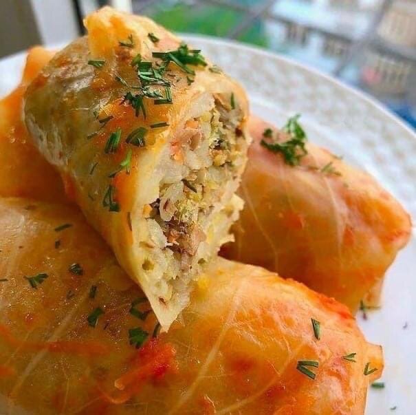 ГОЛУБЦЫ С ЧЕЧЕВИЦЕЙ ИНГРЕДИЕНТЫ: - капуста - 1 кочан - чечевица (отварить) - 200 гр. - рис (промыть горячей водой) - 100 гр. - морковь (натереть) - 2 шт. - луковица - 1 шт. - помидоры - 2 шт. - лавровый лист - 2 шт. - соль и приправы - по вкусу - зелень: свежая петрушка - масло подсолнечное - 50 мл - вода - 750 мл ПРИГОТОВЛЕНИЕ: 1. Кочан капусты разобрать на листья и отварить в подсоленной воде в течение 4 мин, воду слить и остудить. Чечевицу отварить до мягкости. 2. Луковицу нарезать, морковь натереть на крупной терке, добавить соль, приправу, влить масло в сковороду и тушить 3 мин. 3. Половину тушеной моркови отложить для начинки. В оставшуюся часть добавить нарезанные помидоры и тушить 5 мин. - это СОУС, в котором будут тушиться голубцы. 4. НАЧИНКА: в тушеную морковь добавить чечевицу, промытый рис, соль, зелень и всю массу аккуратно перемешать. 5. На каждый капустный лист выложить начинку и завернуть конвертиком, голубцы поместить в сотейник (кастрюлю) влить соус