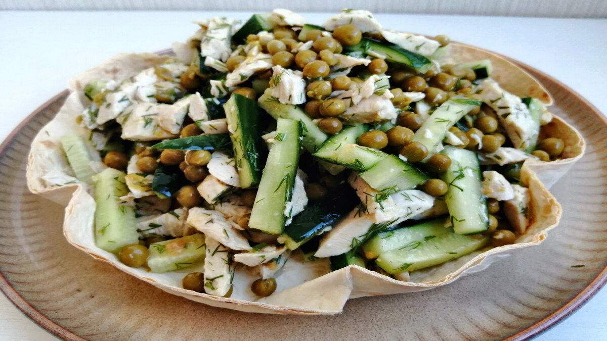 Готовим салат из куриного филе и зеленого горошка на лаваше. Этот рецепт салата из простых продуктов. Очень вкусное сочетание ингредиентов. ******************* **Рецепт** Лаваш Огурец свежий - 1 шт. Куриное филе отварное - 250-300 гр Зеленый горошек - 1 банка Зелень (укроп, петрушка) **Заправка** Масло растительное 30мл Соль Горчица 1ч.л Сок лимона 1ст.л ********************** * Посмотрите ВИДЕО ЭТОГО РЕЦЕПТА на моем YouTube канале "Игра вкусов" * Подписывайтесь!!! https://www.youtube.com/channel/UC-2-5_LEQ0f8H0O-u3Y5hvA?view_as=subscriber Впереди вас ждет много рецептов Приготовить все ингредиенты для приготовления. Разворачиваем лаваш и по тарелки вырезаем круг. Корзинку из лаваша ставим в духовку температура 180градусов на 3-4минуты. Отварное куриное филе и огурец нарезаем толстой соломкой. Делаем заправку смешиваем растительное масло, сок лимона, горчицу, перемешиваем. Корзинка из лаваша готова, выкладыва