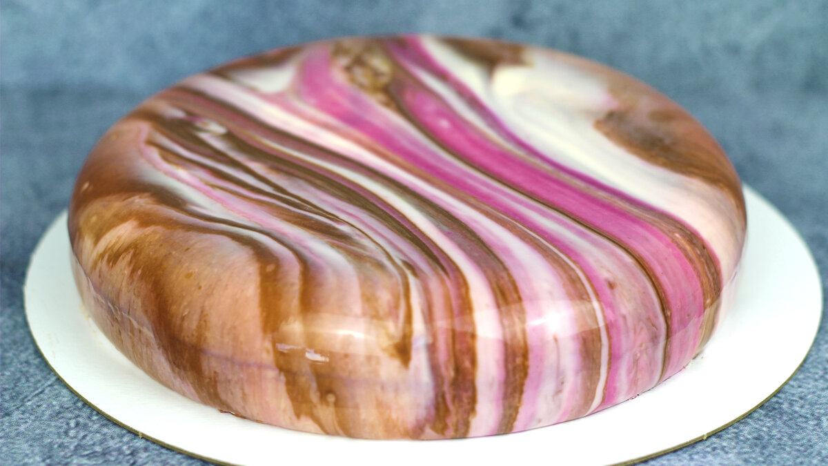 Для хаотичного рисунка глазури я выливаю их в одну ёмкость, не перемешивая. Наливаю цвета один за другим: белый, розовый, коричневый. И снова: белый, розовый, коричневый. Чем прохладнее будут глазури, тем меньше они перемешаются при таком наливании. Но, все же они должны оставаться текучими. Всё, ничего не перемешиваем, просто наливаем глазурь на торт. Как бы вы ни налили, получается красивый хаотичный рисунок. Сразу убираем торт в холодильник вместе с тарелкой, так глазурь быстрее схватится.