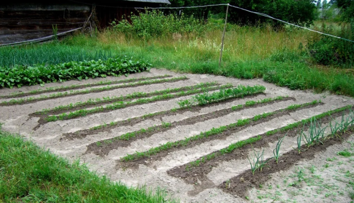 След, оставленный ребром нашей доски, определит место для посева. В эти лунки можно посеять семена редиса, моркови, лука, высадить рассаду.
