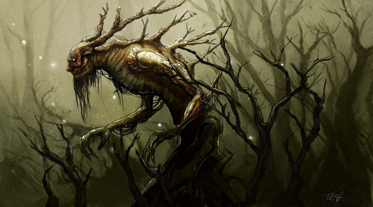 Леший - лесной дух, хозяйничающий, по народному представлению, в лесах. Другие названия его: лесовик, лесник, лешак, лесной дядя, лисун (полисун), дикий мужичок, лес. Нашим лешим соответствуют греческие сатиры, римские фавны, сильваны, немецкие лесные люди (Waldleute), шведские скоугманы и другие. Леший может стать выше самых высоких деревьев и ниже травы. Чаще всего он является в виде рослого мужика, в бараньем полушубке, неподпоясанном и с левой полою, запахнутою на правую; глаза у него без бровей и ресниц, иногда на голове и бороде зеленые волосы; голос оглушительно громкий, глаза страшно блестят; иногда вместо глаз звезды. Иногда Леший показывается голым и напоминает черта: у него рога на голове, ноги козлиные, борода клином, на руках длинные когти, вся нижняя половина тела мохнатая. Нередко Леший оборачивается собакой (Калужская губерния) и волком. Когда Леший идет по лесу дозором, то при его приближении шумит лес, и трещат деревья. Он поет голосом без слов, бьет в ладоши, свищет,