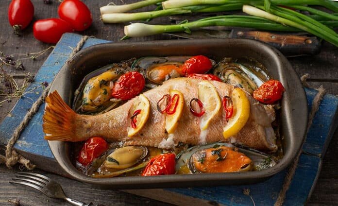 Ингредиенты: 1. Морской окунь 2 шт. 2. Лимон - 1 шт. 3. Зелень 4. Масло растительное 3 столовых ложки 5. Масло сливочное около 50 гр. 6. Соль, перец по вкусу Готовка: 1. Почистить рыбку, срезать спинные плавники. 2. Сделать в тушках небольшие разрезы на расстоянии 3 см друг от друга. 3. Посолить и поперчить внутри и снаружи. 4. Нарезать лимон кружочками, зелень порезать крупно. 5. В брюшко положить немного зелени, кусочек лимона и сливочное масло. 6. Выложить тушки на фольгу, смазанную предварительно растительным маслом, и рыбку тоже следует тщательно смазать сверху растительным маслом. 7. Завернуть плотно в фольгу и запекать в предварительно разогретой духовке до 200 градусов минут 25-35 минут. 8. За 10 минут до окончания приготовления раскрыть фольгу для получения румяной корочки.