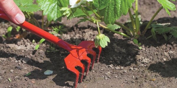 Клубнику нужно рыхлить часто. Оптимальным для проведения рыхления является время после дождя, а также появление большого количества сорняков. В общей сложности рыхлить надо не менее 6–8 раз за вегетационный период. Первое рыхление следует проводить ранней весной одновременно с внесением удобрений. Как только почва подсохнет после схода снежного покрова, нужно взрыхлить ее в междурядьях, а также в рядах вокруг кустов садовой земляники. Рыхление в междурядьях проводят обычной широкой тяпкой на глубину 8–10 см. Рыхление между строчек и в самих рядах проводят либо узкой тяпкой, либо штыковой лопатой на глубину 5–7 см, а вокруг кустов клубники рыхлят на глубину 3–4 см. В это же время следует проводить работы по очищению плантации клубники от сухих листьев и прочего мусора. Перед тем как начать рыхлить, нужно разбросать вдоль рядов с растениями аммиачную селитру из расчета 100–120 г. Надо, чтобы удобрение попало также и под листья клубники. По окончании рыхления нужно с другой стороны ряда