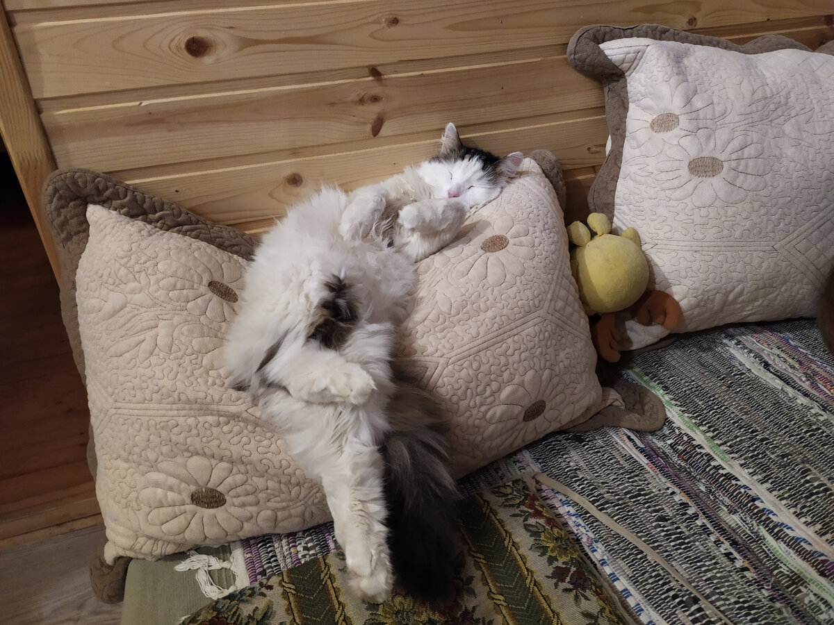 Живущий у нас сейчас кот Тиша – мелкий, смешной, болтливый и очень контактный. Он целыми днями ходит по гостям, по всему поселку, а потому так уматывается за день, что идет домой, ну как тот пьяный, что в каком бы ни был виде, направление знает, и домой хоть ползком. Глаза он уже открыть не в состоянии, а потому ест свою вечернюю пайку с закрытыми глазами, и падает. Дальше на ручках до кровати. Все! Маленьких не кантовать!