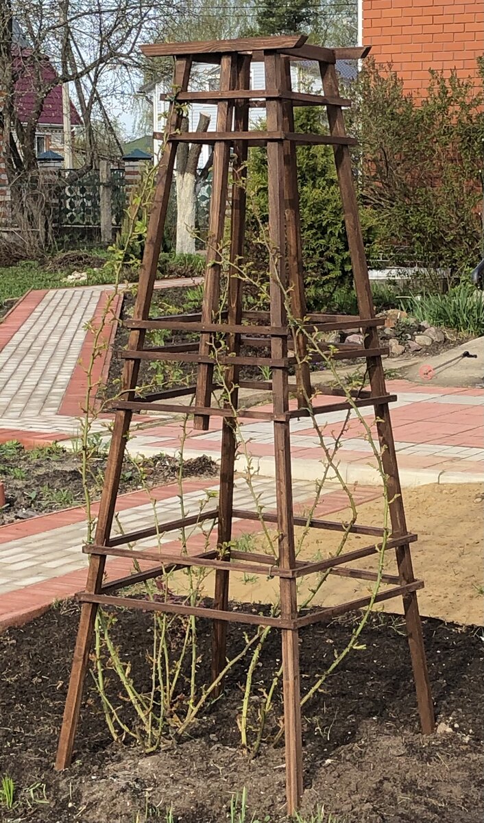 Наконец, среди кучи забот в саду, руки дошли и до плетистой розы, которую срочно нужно было укладывать на опору. Второй обелиск готов, роза обрела надежную опору. Результат совместных усилий моих и мужа на фото: Профессионалы и мастера, если вы читаете этот пост, отнеситесь снисходительно к технической стороне исполнения, это не мастер класс по изготовлению обелисков, специфика у моего канала другая. Мне хотелось показать, как можно нетривиально обыграть плетистые розы в саду. К тому же, для меня важно, чтобы опоры не падали при сильных ветрах. Сегодня в Подмосковье ураганный ветер с порывами, по саду летает все, что может летать, оба обелиска на отлично сдали экзамен на устойчивость. Этот обелиск делали для Flammentanz, куст взрослый 7-8 лет, плети около 2 метров, цветёт обильно, у меня в две волны, к июлю наращивает новые побеги и вся эта зелёная масса гнёт и ломает покупные шпалеры. Роза обладает ещё одним интересным свойством, Flammentanz передвигается по саду, каждый раз, вы