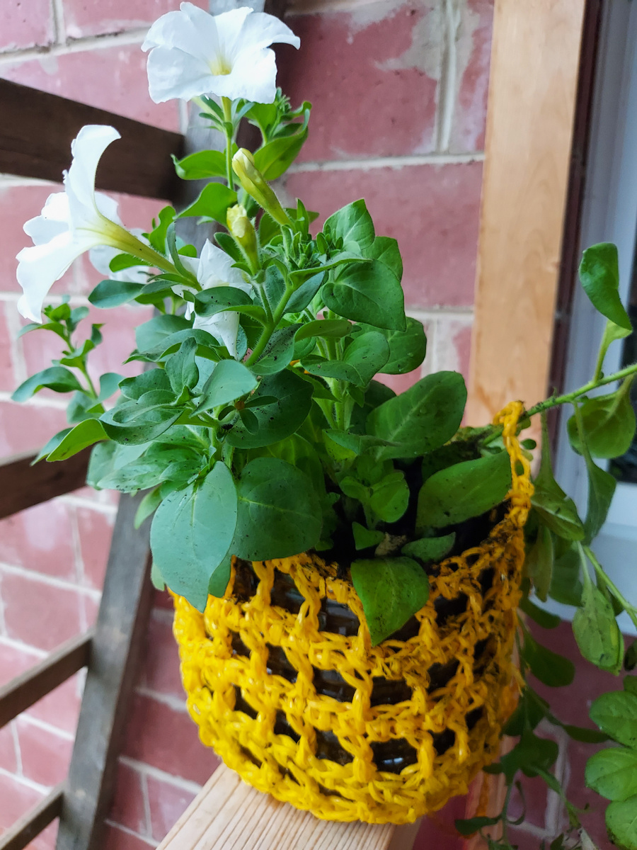 Себистоимость такого кашпо 40 р и пластиковая бутылка)), а получается очень даже уютно. Взяла крючок номер 4 и моток верёвки. Причём верёвка может быть абсолютно любая. Чем толще, тем больше крючок. Связала дно под размер пятилитровой баклажки. Начала бортики. Отрезала нужный размер бутылки и обвязала. Связала веревочки. Для подвешивания купила специальные крючки. Посадила в неё петунью. Получилась красота))