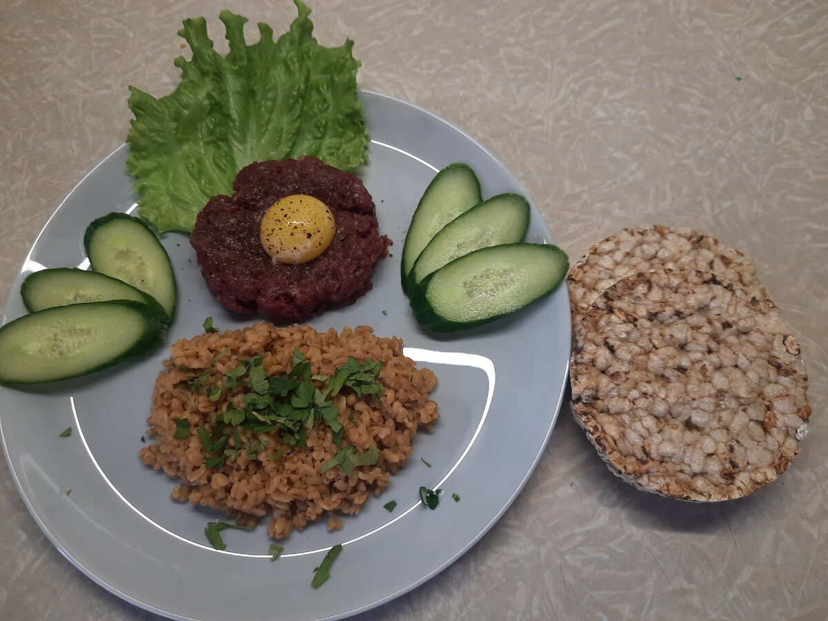 Тартар из говядины с булгуром Для тартара: Вырезка говяжья 100г Лук красный 20г Бальзамический уксус Соль Перец черный свежемолотый Орегано. Мясо должно быть очень свежим и качественным! Нужно хорошо промыть его в проточной воде, обсушить в бумажном полотенце. Удалить все прожилки, пленки. Нарезать максимально мелко. Посолить, поперчить, добавить орегано и 1/2ч.л. бальзамического уксуса. Смешать с мелконарезанным луком. Сформировать на тарелке, сверху положить сырой желток. Слегка поперчить. Для гарнира булгур обжарим на сухой сковорое до золотого цвета, при этом будет исходить бомбический аромат!!! В сотейник или ковшик бросить кусочек масла, я использовал кокосовое. После того как расплавится масло всыпаем булгур и перемешиваем, добавляем воду, по обьему в 3 раза больше обьема крупы, присаливаем и варим на медленном огне до готовности. Приятного аппетита!!!