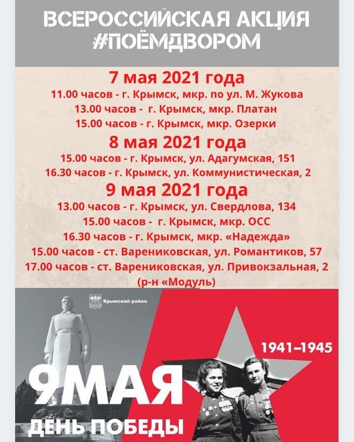 В преддверии празднования 76-й годовщины Победы в Великой Отечественной войне на территории многоквартирных домов пройдёт Всероссийская акция #Поемдвором, в рамках которой любимые всеми песни военных лет для вас исполнят творческие коллективы учреждений культуры@kultur_krymsk