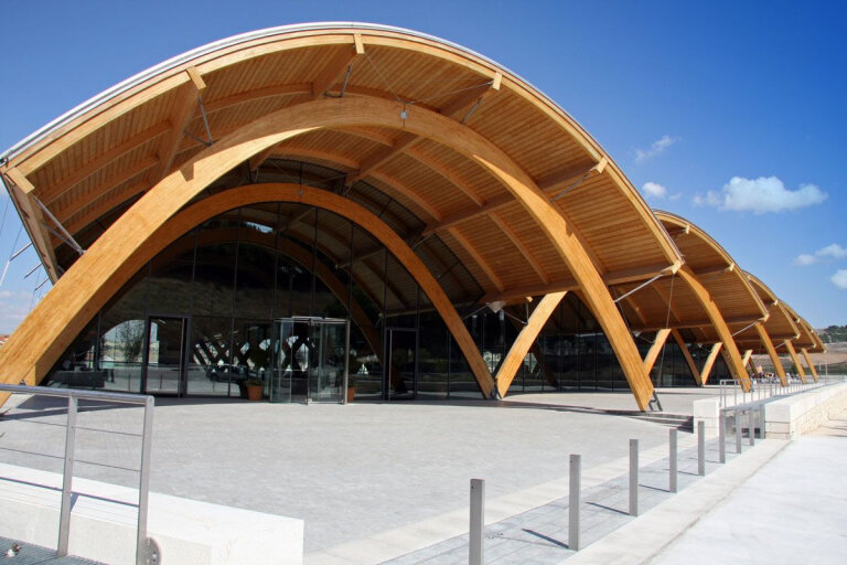Клееный брус можно использовать как длиннопролетный материал. Его можно предварительно изготовить с помощью металлических соединителей в фермы, охватывающие до 45 метров (150 футов). Однако наиболее экономичными формами являются сжатые формы многоарочного свода с пролетами до 93 метров (305 футов) и ребристые купола с пролетами до 107 метров (350 футов). Они часто используются в качестве промышленных хранилищ для таких материалов, как глинозем, соль и калий, которые вызывают коррозию стали или бетона. Такие деревянные конструкции обычно встречаются только возле лесных массивов; транспортировка пиломатериалов в другие районы увеличивает их стоимость. Стальные конструкции Сталь - основной материал для длиннопролетных конструкций. Изгибные конструкции, изначально разработанные для мостов, такие как плоские балки и фермы, используются в длиннопролетных зданиях. Пластинчатые балки сварены из стальных листов, чтобы сделать двутавровые балки глубже, чем стандартные прокатные профили, и котор