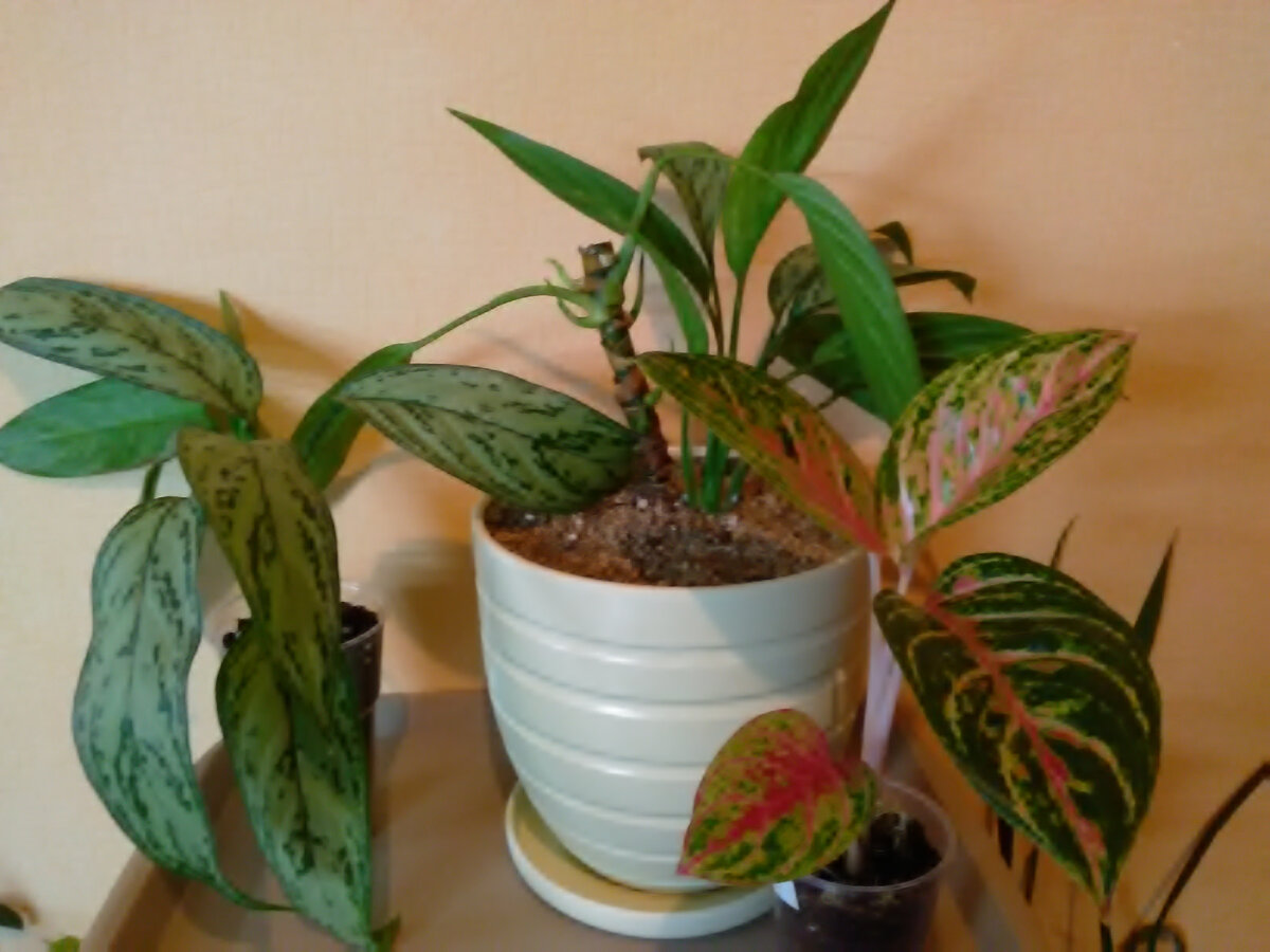 Пару недель назад я решилась срезать верхушку у самой первой своей аглаонемы. Той, что живёт у меня с июля 2019, почти два года. Захотелось сделать более пушистый кустик. Заодно и пересадила. Горшок вопреки рекомендациям - слегка "на вырост". Предполагаю, что этот экземпляр достаточно неприхотливый и сможет пережить большой объём грунта, не освоенный корнями. Стараюсь сильно не поливать. По сравнению с фото, сделанным до пересадки, заметен рост боковых почек. Выглядит вроде бодренько, надеюсь, что со временем в этом горшке ей будет комфортно. Те аглаонемы, которые купила десять дней назад тоже понемногу растут. Я не послушалась продавцов и самых маленьких переселила в более просторные стаканы. Сразу после покупки так обычно не делают - нужно, что бы растения вначале привыкли к новому месту. Но мне очень захотелось дать больше простора юным корешкам - надеюсь, что "молодёжь" быстро освоится. Наиболее резво пошла в рост Баттерфляй - та, которая не подверглась переселению. Выпусти
