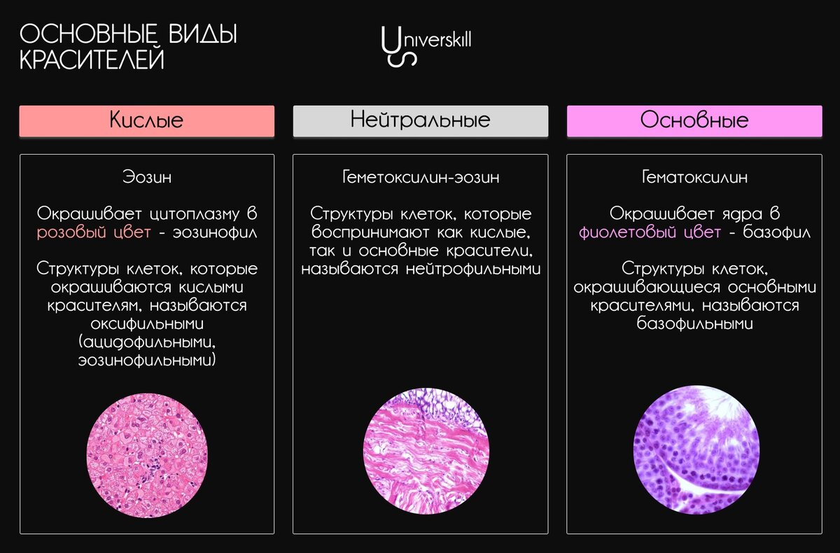 Основные гистологические термины, связанные с окраской: 🔸 Оксифилия - явление, при котором структуры клеток (оксифильные/ацидофильные) окрашиваются кислыми красителями Например: цитоплазма, эритроциты 🔹 Базофилия - явление, при котором структуры клеток (базофильные) окрашиваются основными красителями Например: ядро (за счёт большого количества ДНК и РНК внутри) 🔸 Полихромазия (полихроматофилия) - способность окрашиваться как основными, так и кислыми красителями 🔹 Метахромазия - явление, при котором структуры клетки окрашиваются в цвет, который отличается от цвета используемого красителя