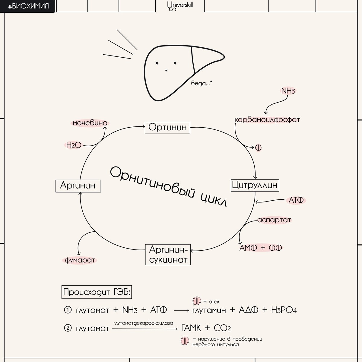 Как связаны нарушения работы печени и головного мозга? 🤕 Ни для кого не секрет, что печень - один из основных жизнеобеспечивающих органов, имеющий множество функций. Так, гепатоциты предотвращают накопление токсичных соединений, образующихся в результате обмена аминокислот, главным образом - аммиака В норме аммиак подвергается обезвреживанию и выводится почками в виде мочевины. А мочевина, как раз таки, образуется в печени в орнитиновом цикле Представим, что нарушилась работа печени = нарушается работа ферментов = орнитиновый цикл не работает = аммиак на свободе 🤭Аммиак способен проходить через гематоэнцефалический барьер (ГЭБ), связывается с глутаматом, образуя глутамин в клетках нейроглии Глутамин соединение полярное, поэтому активно присоединяет к себе воду, в итоге - набухание астроцитов (эти ребята «кормят» клетки мозга) и даже отёк мозга. Но это ещё не все шалости аммиака в тканях мозга! Глутамат является источником ГАМК - основного тормозного медиатора. Как мы уже выяснили, ам