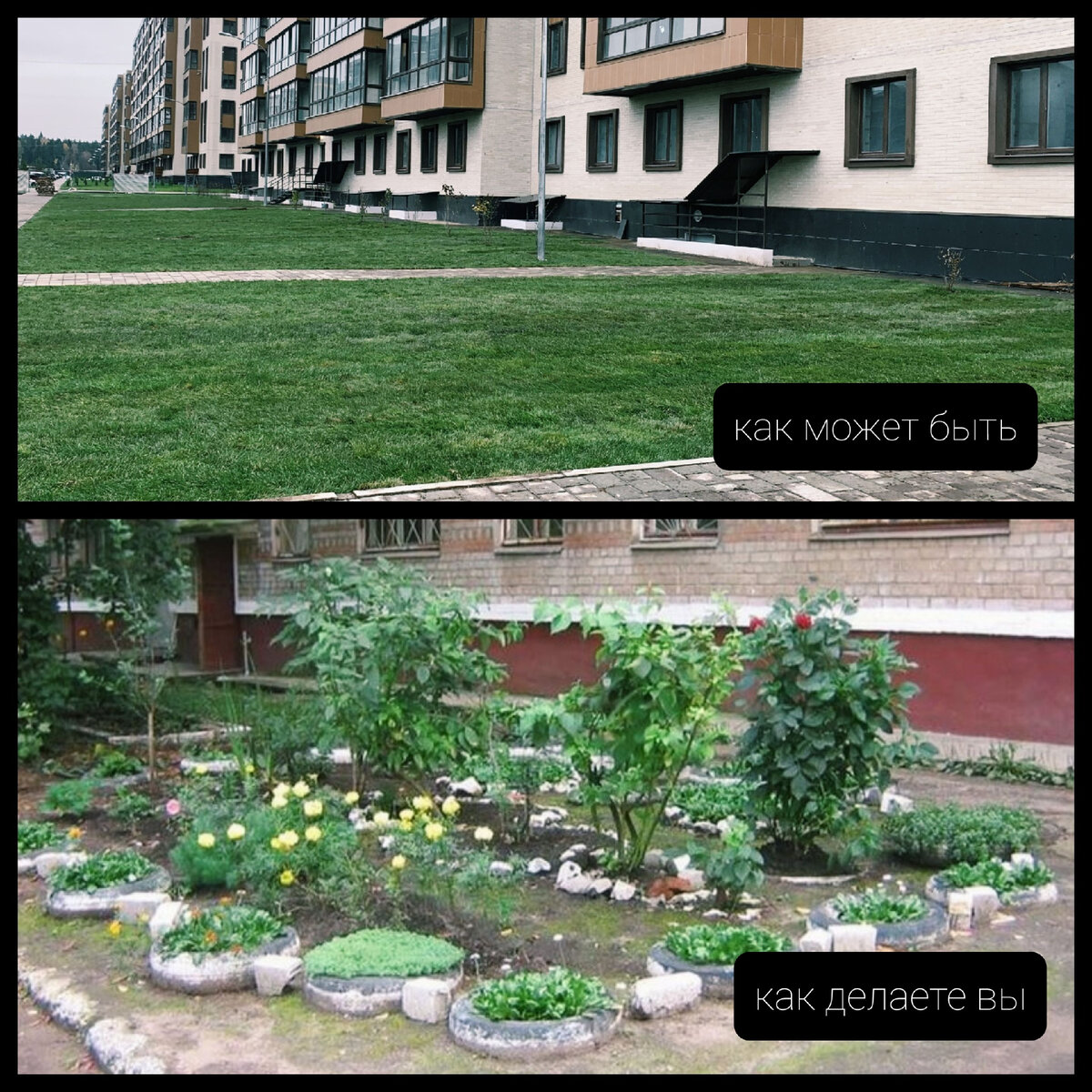 Хочется обратиться ко всем женщинам, считающим, что эти цветочки действительно украшают город: "Вы уже выбрали лучшего президента, лучшую пенсию, лучшие социальные программы, и живете в идеальном мире. Для полного блеска не хватает только этих цветочков". Только вы, кажется, забыли, что на этой же территории проживает более молодое поколение, которому ваши цветочки возле разваливающихся панелек видятся как кладбищенские цветы на похоронах всей нашей страны. На улицах валяется мусор, пакеты, шприцы и бутылки, которые вы могли бы собирать, делая мир чище, но вместо этого вы тратите силы и время на украшение этой помойки. Вы могли бы посадить газон и ухаживать за ним, чтобы придовомая территория выглядела свежо и аккуратно, но вместо этого вы делаете из мусора уродливые подделки, ломающие детям психику. Вас радуют клумбы, сделанные из кирпичей, пластиковых бутылок и старых покрышек, но со стороны это выглядит как геометрическая свалка. Все это можно сдавать на переработку! Из покрышек, на
