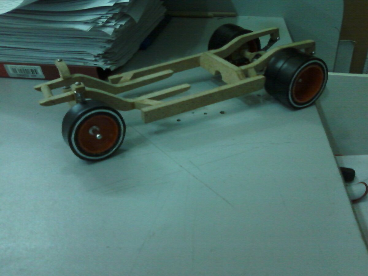 Данная моделька (ссылка для тех, кто любит смотреть видео) строилась на работе в свободной от работы время). Разумеется, ни о каких блогах на тот момент я не думал, поэтому процесс не фотографировал. Спасибо моему другу и коллеге, который заснял, сохранил и по моей просьбе нашел и прислал мне фотографии некоторых этапов изготовления. Сразу хочу попросить прощения за качество фото - это было в далеком 2012 или 13-м году. Начал я с рамы, которая в полной мере повторяет форму и расположение лонжеронов в оригинальной "Волге" ГАЗ-24. На раму была смонтирована подвеска. Сзади, как и должно, мост на рессорах (из кусочков упаковочной ленты, скрепленных скобами от степлера), спереди - амортизаторы из заклепок с пружинами от шариковых ручек). Колеса сделаны из заглушек для пластиковых труб и обмотаны изолентой двух цветов для создания белой ретро полосы. Далее на раму был выгнут пол (из куска потолочной алюминиевой рейки) и установлен мотор V8 с нагнетателем и воздухозаборником. Роль выхлопного