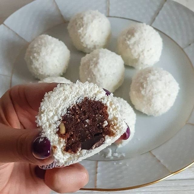 Конфетки ИНГРЕДИЕНТЫ: ✔Творог 180 гр ✔Курага/изюм 100 гр ✔Орешки 50 гр ✔Шоколад 30 гр ✔Сах зам по вкусу ✔Кокосовая стружка В творог добавляем сах зам, хорошо перемешиваем. Сухофрукты, шоколад и орешки измельчаем в блендере. Влажными руками формируем из творога лепешечки) В середину кладём начинку из сухофруктов и орешек, формируем шарики, обваливаем в кокосовой стружке и убираем застывать в холодильник на 30-50 минут) Вкусняшка👍👍👍 КБЖУ 265.86/12.35/14.48/22.42