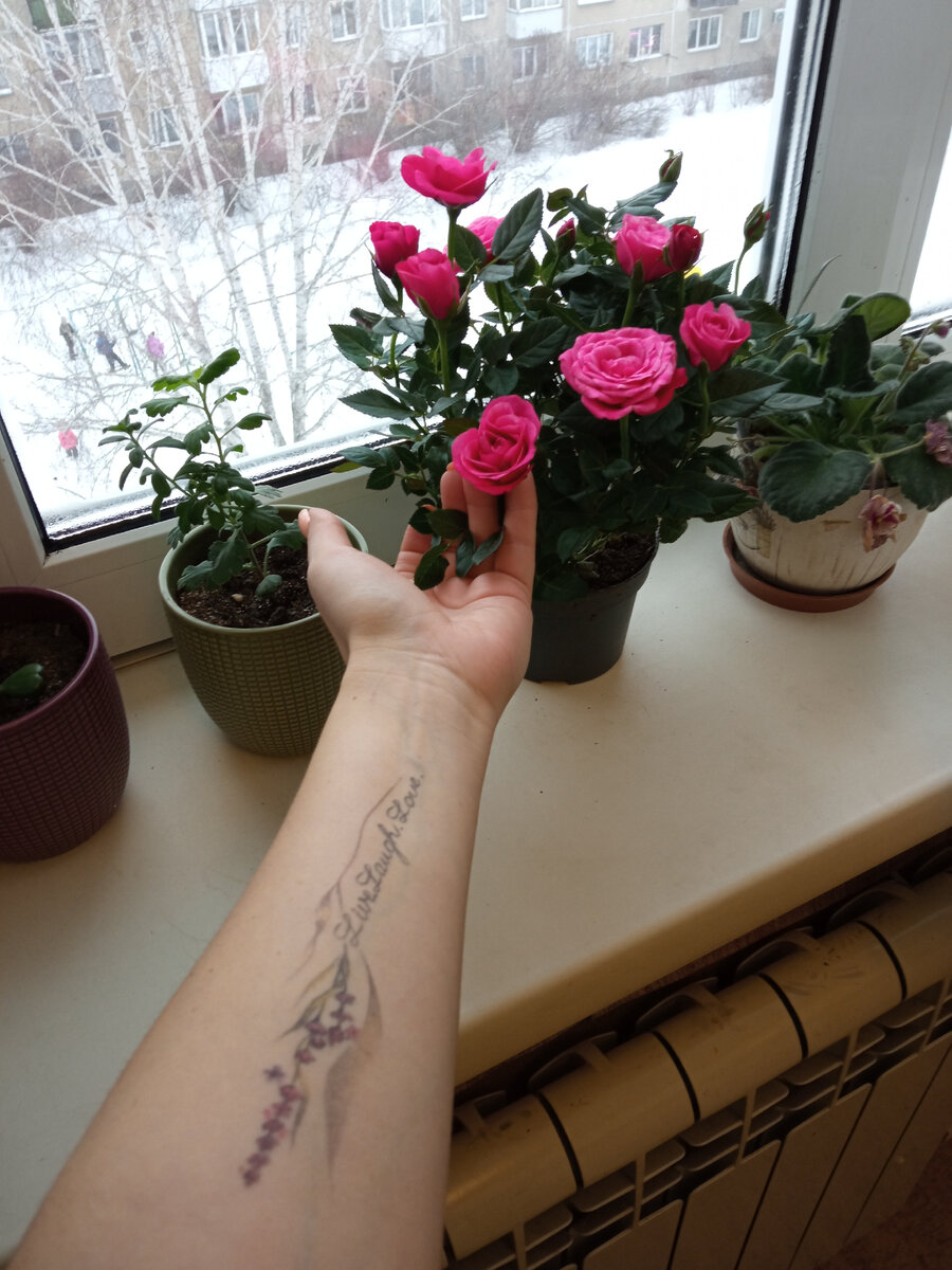 В 32 года я поняла, что без тату жизнь скучна и не интересна. Вот как только я его набью - жизнь сразу заиграет всеми красками радуги! А на самом деле, просто я настолько давно хотела татуировку, что даже самой стало стыдно перед самой за своë нереализованное желание! Когда наконец решилась, начала искать вариант, что же запечатлеть. Картинка в голове была очень размытой. Муж знатно помог: зарубал все мои идеи на корню, лишь бы я успокоилась и передумала! Моя нереальная любовь к цветам задала тематику. То есть тату должна была быть цветочной, как символ моего увлечения! Но, так как я хотела ещё и смысловую нагрузку, то пришлось почитать про символику тех цветов, что мне нравились! Лаванда подошла мне больше всего, как символ нежности, чистоты помыслов, долголетия и здоровья... И ещё много чего про не пишут в разных источниках, но я, конечно, вычленила только то, что мне важно! И вот, я это сделала! На тату есть слова на английском - живи, смейся, люби! Это мой девиз по жизни :