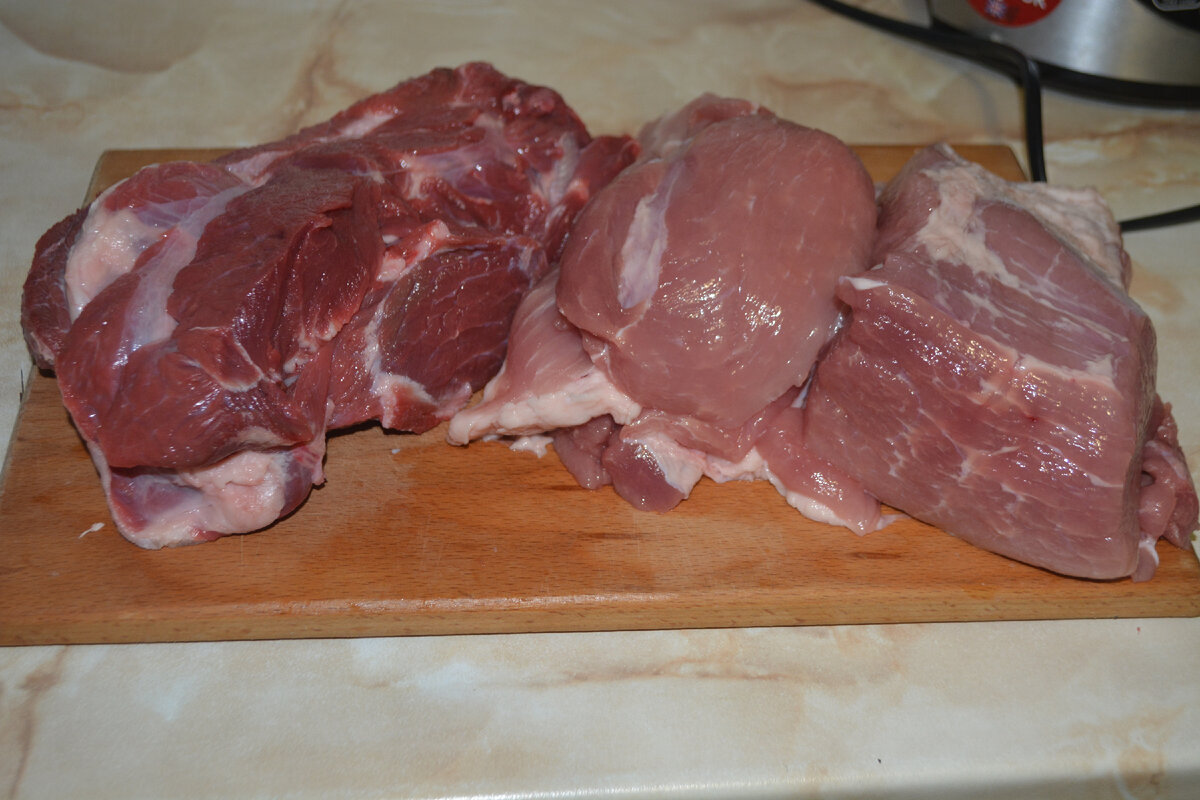 Всем любителям пельменей посвящается)))... Друзья, привет! Так случилось, что на майские праздники я остался в гордом одиночестве, да ещё и работаю почти все выходные и дабы особо не заморачиваться с готовкой (кормить то кроме себя любимого некого), решил налепить пельмешек, а поскольку я прям таки фанат, то могу спокойно только ими каждый день и питаться. Фарш стандартный свинина говядина 1/1. Говядину беру шею, она хоть и жилистая , но зато очень насыщенная по вкусу. Вобщем лишние жилки по возможности убираем и делаем фарш. Я использую среднюю или самую мелкую решётку мясорубки. В этот раз фарша получилось многовато, поэтому примерно полкило я сразу в пакет и в морозилку про запас. Многие говорят, что для сочности в пельменный фарш нужно класть много лука, ну тут не знаю, много не много но на 1,5 кг фарша у меня всего 2 небольших луковицы, у нас всё таки мясная начинка, а не луковая. Чеснок по желанию, я кладу 3-4 зубчика. Специи, тут вообще "не паханное поле" для фантазии. У меня на