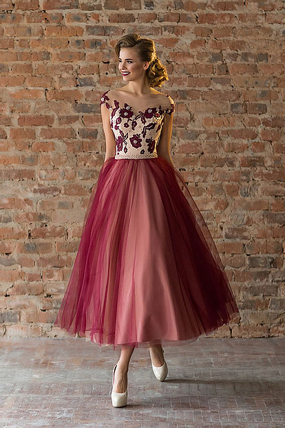 Деликатная игра контрастов и воздушная юбка «чайной» длины делают вечерние платья кокетливыми и притягательными. Всегда выигрышный корсет выполнен в этот раз из ткани перламутрового оттенка, прекрасно дополняющей выразительные бордовые аппликации. Изящные драпировки и летящий силуэт придают этому платью непередаваемую лаконичность. Узкий пояс на талии замечательно подчеркивает стильные линии кроя. Маленький рукавок - очарователен, а V-образный вырез так притягателен... Лиф с прозрачным декольте из сетки декорирован роскошным вышитым узором из камней и бисера. Кремовый цвет подкладки контрастирует на фоне пышной юбки из фатина глубокого винного оттенка. Утонченный женский костюм-двойка: кроп-топ, декорированный цветочной вышивкой, с прозрачной кокеткой и рукавами плюс юбка из эко-кожи. Красивый вечерний комплект: кроп-топ на трикотажной подкладке, украшенный блестящим гипюровым декором, и юбка из эко-кожи с завышенной талией. Этот комплект прекрасно смотрится днем и вечером, а изыскан