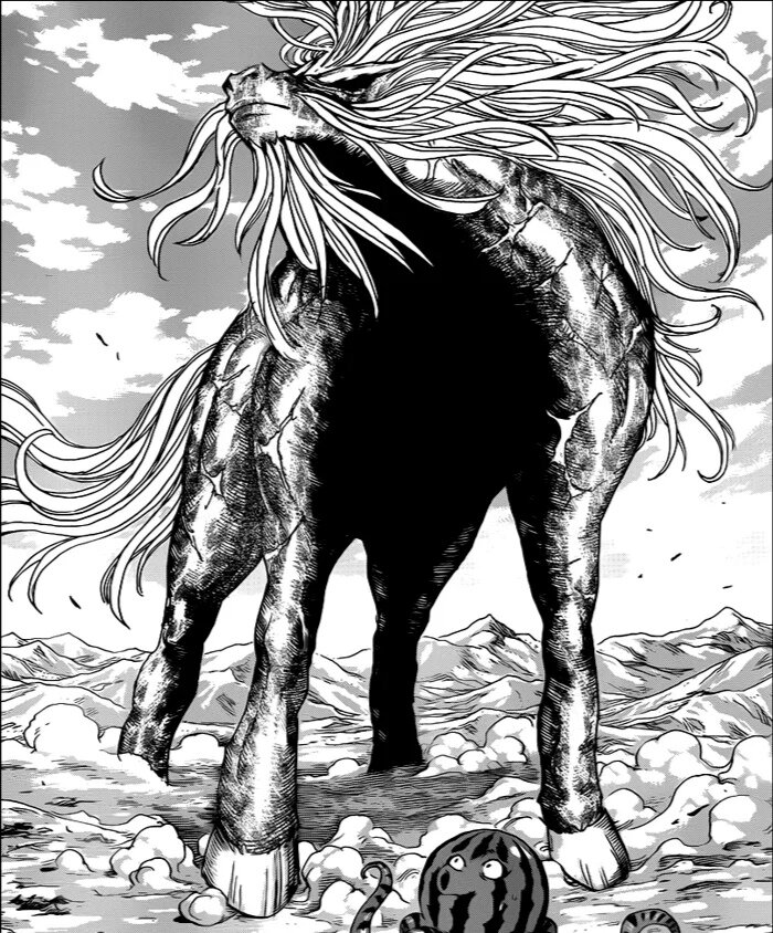 Номер 10 - Геракл (Торико) 22 км. Это существо бессмертного и считается существом мифического размера. Номер 9 - Зунеша (Ван Пис) 35 км. Слон, сопостовимый с целым островом. Номер 8 - Z-Мастер (Король храбрецов Гаогайгар) 40.000 км. Размер этого монстра сопостовимый с планетой Юпитер. Номер 7 - Королевская змея (Торико) 220.000 км. Больше половины расстояния от Земли до Луны. Номер 6 - Космический тайпан (Торико) 80.000.000 км. Примерно половина расстояния от Земли до Слолнца. Вид змей, питающихся планетами. Номер 5 - Грандзебома (Гуррен-Лаганн) 52 млрд световых лет. Диаметр видимой вселенной около 30 млрд световых лет. Номер 4 - Супер Тенген Топпа (Гуррен-Лаганн) 52 млрд световых лет. Является последней версией Гуррен-Лаганна. Номер 3 - Божественный Шенрон (Драгон бол) 57 млрд световых лет. Во много раз больше, чем расстояние между 6 и 7 вселенными. Номер 2 - Антиспиральщики (Гуррен-Лаганн) 93 млрд световых лет. Коллективное сознание целой расы, появившемся в результате