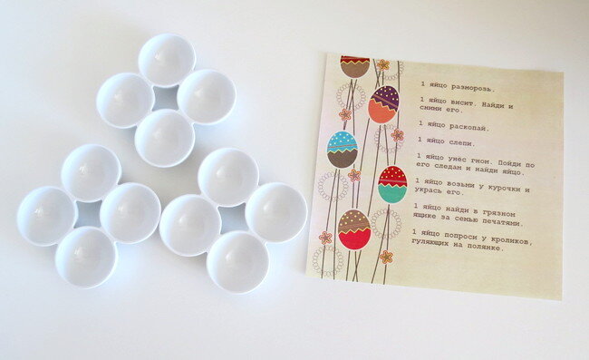 В день Пасхи сын обнаружил на тумбочке мягкого зайца, лотки для яиц и лист с заданиями. Зайка сказал: «Давай поиграем? Сможешь ли ты принести мне все яйца из этого списка?». Сын, конечно, с энтузиазмом согласился. Я зачитала список. Задания выполнялись в произвольном порядке, потому что к некоторым из них ребёнок жаждал приступить немедленно.