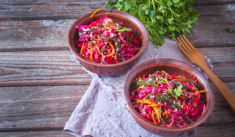 5․Овощи: просто капусту, морковь, маринованную морскую капусту, свеклу соедините в большой чашке для салата, посыпьте кунжутом, заправьте любимым растительным маслом. Проверьте на вкус в плане соли, украсьте колечками зеленого лука. Приятного аппетита!