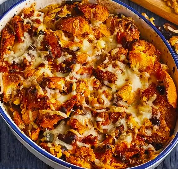 Нам понадобится: подсохший багет - 1 шт., сливочное масло - 80 гр., тертый сыр - 150 гр., коричневый сахар - 350 гр., сухофрукты - 100 гр., орехи жареные - 80 гр., корица - 1 палочка, гвоздика - 2 палочки, анис - 1/4 ч. л., растительное масло - 3 ст. л.