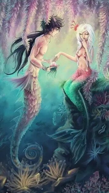 -Веда!... Веда!!.... Веда!!!.... Да где же она? Океан не настолько большой... -Эй, парень, кого потерял? -Доброго дня. Подругу. Не видел здесь такую девчушку на вид подросткового возраста с тёмно-изумрудной чешуёй, почти полностью прозрачным плавником на конце хвоста и фиолетовыми волосами, собранных сзади грубой верёвкой сделанной из сухопутных растений? -Нет. -Что ж...тогда я продолжу поиски... -Странные вы создания.! -А? -Говорю, что вроде и не русалки... мы по крайней мере не выходим на сушу и живём только в воде. А вы мечетесь везде... -И что? -Говорите, можете многое, а найти подругу не можешь. -Может она уже и не здесь, а где-то за пределами воды. -Возможность из воды на суше поискать её нет? -(молча качает головой) -Значит не такие вы и всемогущие. -Мы так о себе никогда не говорили...! -Ну ну...не путаешься с таким длинным хвостом? -Нет. Мужчина, если вы не способны мне помочь, то хотя бы не мешайте.! -Постой...кажется припоминаю фиолетоволосую девку...с таким же нелепым длинн