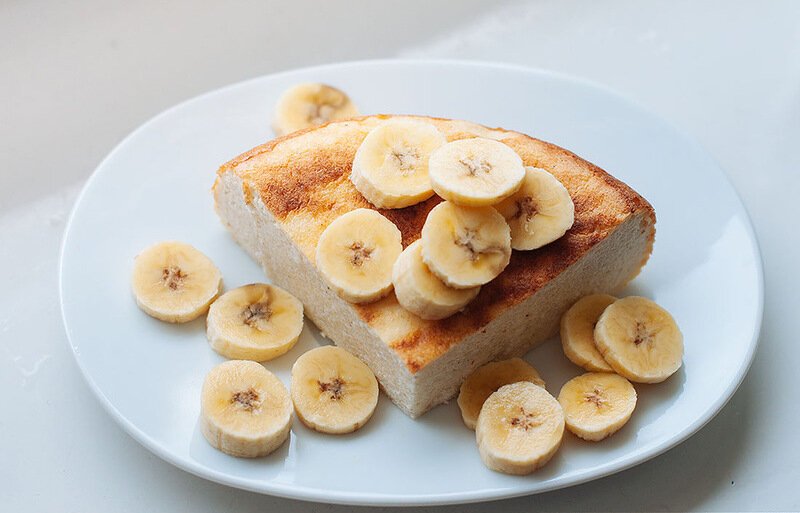 Хочу поделится рецептом невероятно вкусной запеканки! Она получается мягкая, нежная, с ярко выраженным банановый вкусом! Итак, для приготовления нам понадобится: -творог 200г -1 банан -2 яйца -манная крупа 2ст.ложки -щепотка соли -мёд или сахар по вкусу Приготовление: Белки отделяем от желтков, белки взбиваем до пиков, а желтки отправляем в предварительно взбитому в блендаре творог и банану, посолить, посадить и добавить манную крупу, в последнюю очередь добавить взбитые белки и хорошо перемишать,выложить в форму и отправить в разогретую до 180 градусов духовку на 40мин.,готовность проверять нажом, если от выходит сухим-готово. Приятного аппетита! Питайтесь правильно и будьте здоровы!