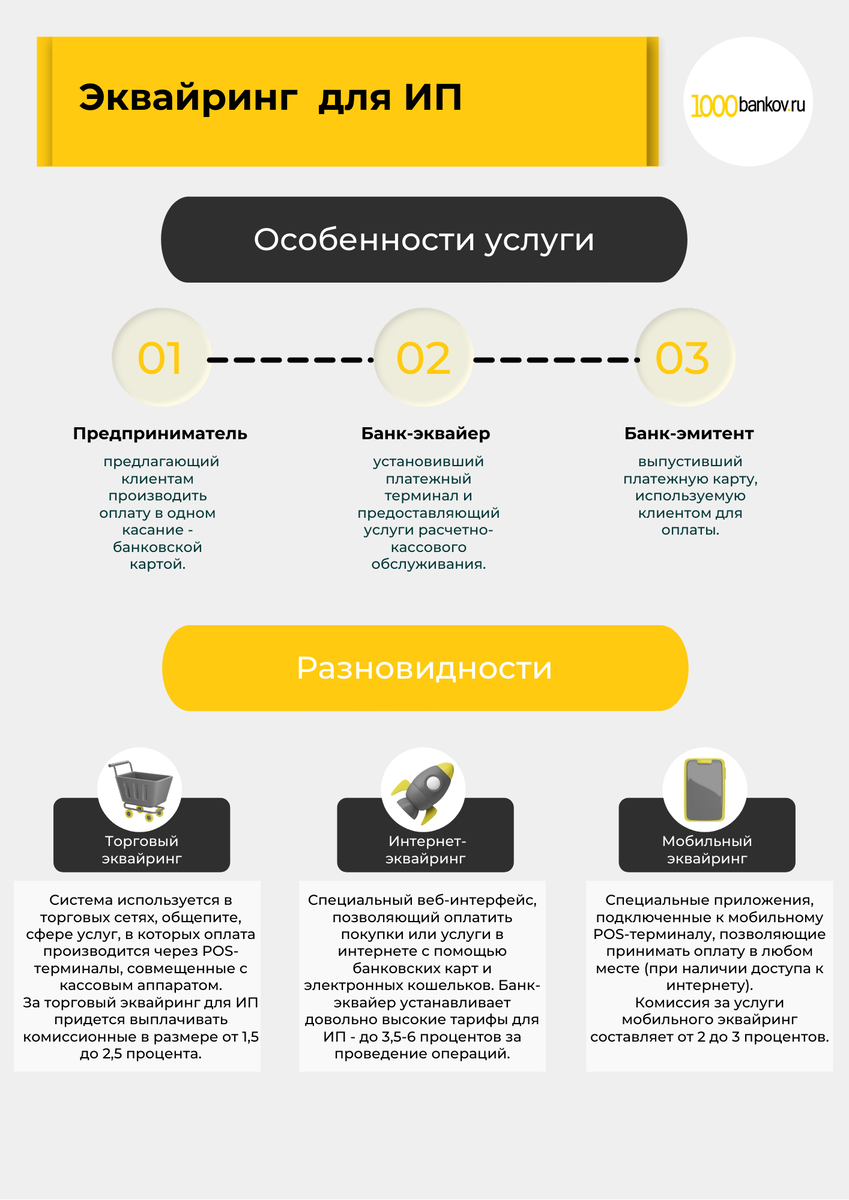 Особенности услуги Эквайрингом называется безналичная оплата товара или услуги в платежном терминале или на кассе посредством пластиковой карты. В процессе участвуют: Банки, предоставляющие эквайринговые услуги - члены не только международных платежных систем: Visa, MasterCard, American Express, но и национальной системы МИР. Разновидности ИП решает самостоятельно, какой вид эквайринга выбрать, отталкиваясь от вида и формы деятельности. Банки предлагают следующие разновидности. Торговый эквайринг Система используется в торговых сетях, общепите, сфере услуг, в которых оплата производится через POS-терминалы, совмещенные с кассовым аппаратом. За торговый эквайринг для ИП придется выплачивать комиссионные в размере от 1,5 до 2,5 процента. Интернет-эквайринг Специальный веб-интерфейс, позволяющий оплатить покупки или услуги в интернете с помощью банковских карт и электронных кошельков. В связи с необходимостью обеспечения повышенной защиты платежных операций при оплате в интернете, банк-эк