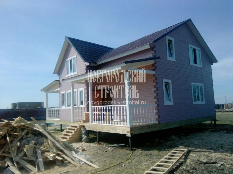 География построек компании "Новгородский строитель" достаточно велика - от Беларуси до Урала, от Мурманска до Крыма. Один из проектов был реализован как раз в Крыму, неподалеку от Симферополя. Окрашенный дом из профилированного бруса 140х140 мм возведен по проекту "Астрахань". По сравнению с базовым проектом, внесено только одно крупное изменение: слева к гостиной пристроена еще одна крытая терраса. В дальнейшем заказчики планировали устроить там съемное остекление. Одна из особенностей проекта - наличие санузлов и на первом этаже, и в мансарде, а также отдельно выполненный навес на большим крыльцом-верандой. Сруб возводился на свайно-винтовом фундаменте, нижние венцы достаточно высоко подняты над землей. Утепление межвенцового пространства - джутовая лента, двойное основание пропитано антисептиком и утеплено каменной ватой толщиной 150 мм. Фронтоны сложной многоскатной крыши выполнены каркасными, также с утеплением каменной ватой (150 мм). Снаружи они обшиты имитацией бруса, внутри -
