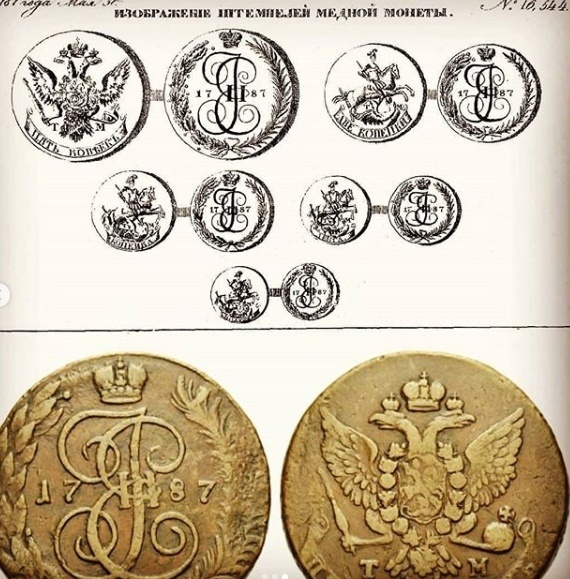 30 мая 1787 года вышел именной указ Екатерины II № 16544, данный Сенату о допущении медной монеты, изготовленной на Таврическов монетном дворе в оборот по всей Российской империи. . Монетный двор располагался в двух километрах от Феодосии, в урочище Ташлык, неподалёку от бывшего ханского дворца. Этот двор прежде чеканил монету из меди для последнего крымского хана Шахин Гирея ибн Ахмет Гирея. . В сентябре 1783 года был издан указ об отправке из Москвы в Феодосию необходимых инструментов и специалистов монетного дела в подчинение великого князя Григория Александровича Потёмкина. В начале 1785 г. были сделаны пробные оловянные штемпеля для будущей медной монеты, которые были отправлены князю Потёмкину. Ордером от 23 мая 1785 года князь, успевший опробовать присланные ему штемпели, порекомендовал оттискивать на выпускаемых в Феодосии монетах литеры “Т. М.”. . В 1787 г. Феодосийский монетный двор заработал – на меди, привозимой из Турции. К концу 1787 года было отчеканено уже до 27 000 руб