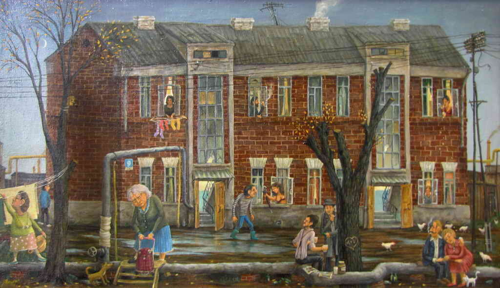 Здравствуйте, уважаемые читатели "Позитива красок"! Хочу познакомить вас с одним интересным художником, который пишет о нашей жизни, как есть, без прикрас. Его картины - это истории нынешней реальности сквозь призму гротеска. Здесь сходятся воедино правда и вымысел, преувеличивается безобразное и высмеивается печальное. Юрий Шеров создает свои полотна в стиле примитивизма. Мне он напомнил по своему исполнению картины Валентина Губарева (статью о нем можно почитать здесь). Наверное потому, что наш сегодняшний герой тоже открывает зрителю обыденность, не стараясь замаскировать, например, обшарпанный угол дома, ведь на картине проще сделать "косметический ремонт", чем в реальной жизни... Впервые с творчеством художника я познакомилась, когда на глаза попалась картина "Дворик". Она меня сразу "зацепила" своей правдой, своей простотой, что называется, без шелухи... Согласитесь, это дворик каждого из нас, знакомый до боли. Эта старушка - как собирательный образ любой нашей соседки, которая к