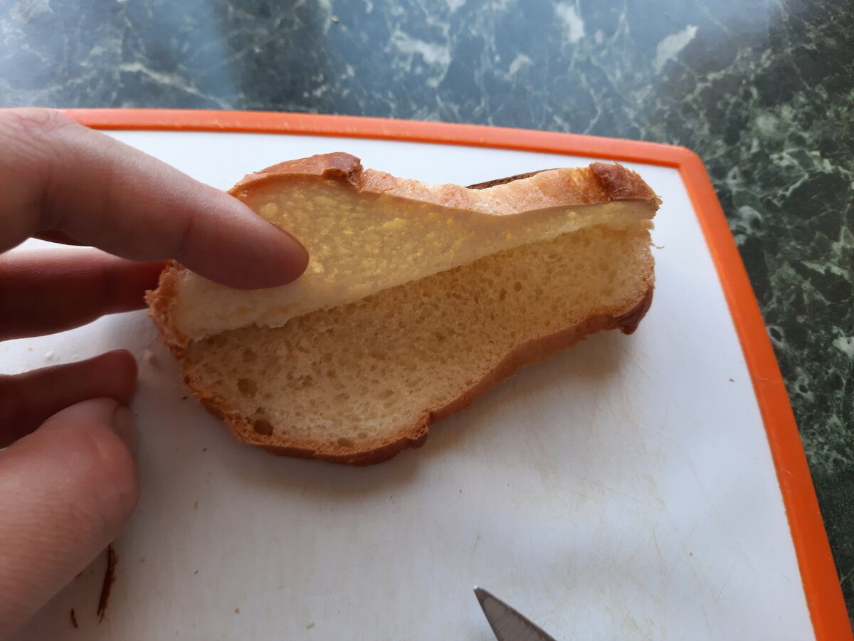 Берем кусочек батона и разрезаем его посередине , но не до конца.