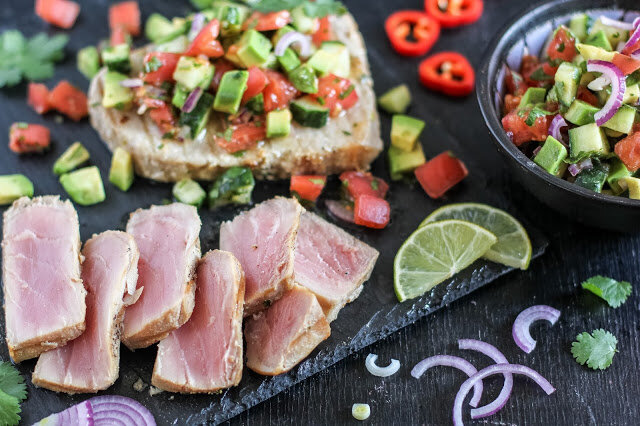 Слегка обжаренный на гриле тунец прекрасен и сам по себе. Но если к нему все таки добавить простой салат из свежих авокадо, огурцов и томатов он станет еще интереснее. К тому же тогда вам не придется готовить гарнир. Каких-то минут 15 и ваш ужин готов!