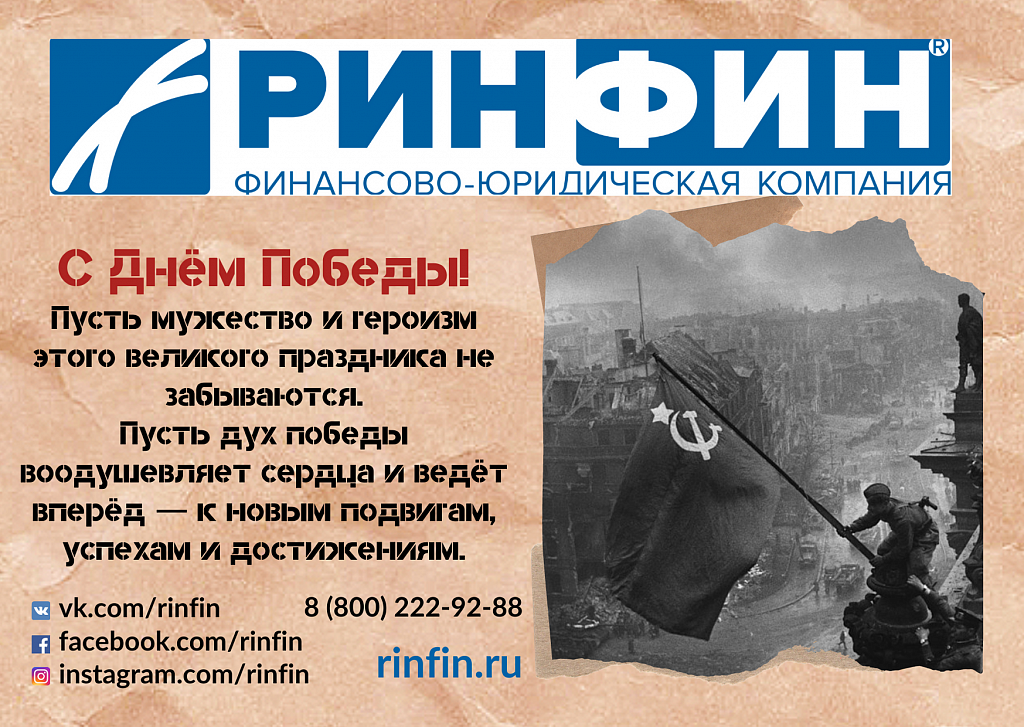 Коллектив АО «РИНФИН» поздравляет 9 мая. 9 мая наша страна традиционно отмечает День Победы в Великой Отечественной войне. Сегодня это день памяти о миллионах погибших, перед которыми мы в неоплатном долгу. Напомним, что первый раз праздник День Победы отмечали 9 мая 1945 года. Праздник во многом был стихийным и поэтому незабываемым: именно 9 мая 1945 года в СССР было объявлено о Победе в Великой Отечественной войне…