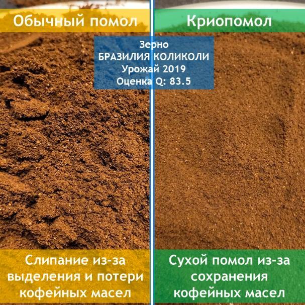 Это ведет к тому, что при заваривании такого кофе в нем уже гораздо меньше ароматных и полезных компонентов. При криопомоле масла в микропорах находятся в застывшем виде и при помоле не выдавливаются, а, наоборот, сохраняются внутри частичек.