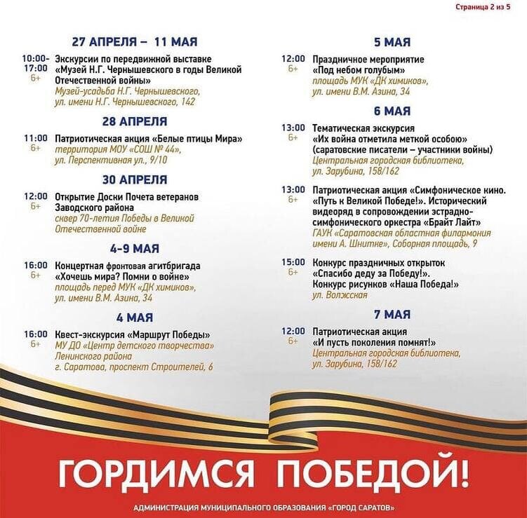 В Саратове обнародовали программу мероприятий, посвященных 76-летней годовщине Победы в Великой Отечественной войне. Соответствующий пост в Instagram разместил глава города Михаил Исаев. До 11 мая в музее имени Чернышевского будет работать передвижная выставка. Она посвящена работе музея в годы войны. 7 мая, 12:00 - патриотическая акция «И пусть поколения помнят!». Улица Зарубина, 158/162; 7 мая, 12:00 - акция с возложением цветов «Служение Отчизне: Герой Советского Союза Н.М. Скоморохов». Библиотека № 37 на Бульваре Героев Отечества; 7 мая, 13:00 - конкурс инсценированной патриотической песни «Нам песни эти позабыть нельзя». Улица Большая Горная, 139/141; 7 мая, 16:00 - концерт «Нам нужна одна Победа». Сад «Липки»; 7 мая, 17:00 - мероприятие «Прекрасный май Победы». Сквер имени Марины Расковой; 8 мая, 8:00 - церемония возложения венков и цветов к монументу Воину-освободителю на мемориальном комплексе «Братская могила». Воскресенское кладбище; 8 мая, 9:00 - вахта памяти «Пост №1». Ме