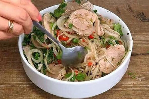 Приготовив всего однажды наивкуснейшее мясо по этому рецепту, вы будете готовить его снова и снова — настолько вкусной, ароматной и восхитительной является эта холодная мясная закуска! Ингредиенты: Для вкусного маринада берем следующее: Приготовление мясной закуски «Холодный шашлык» Отвариваем мясо. В кипящую воду кладем целый кусок мяса. Добавляем 2-3 листика лаврушки, несколько горошков черного перца, целую луковицу (я еще втыкаю в нее пару соцветий ароматной гвоздички). Солить будем не сразу, а в конце варки — за 10 минут до готовности. Варим мясо примерно 40 минут. Важно — не переварить, чтобы не получить сухость. Поэтому почаще проверяйте мясо, сделайте надрез — если сок прозрачный, мясо готово. Если выделяется мутный или красный сок — варим дальше. Варить лучше на среднем (не на маленьком огне), ведь нам нужен не бульон, а сочное мясо. Пока готовится мясо, смешаем все ингредиенты для маринада — сперва жидкие — масло, воду, сок лайма, или лимона и бальзамический уксус. Затем — сух