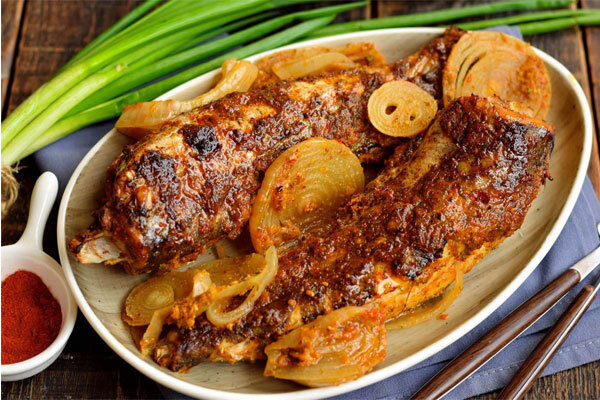 Одна из вариаций приготовления вкусной рыбы в духовке. Используем целые тушки минтая, но при желании их можно разделить на отдельные филейные куски. Рыбу запекаем на луковой подушке в овощном маринаде на основе сладкого перца, чеснока и зелени. Для пикантности добавляем горчицу, для усиления вкуса — сок лимона. Благодаря маринаду рыба имеет необычный вкус и зажаренную корочку сверху. Ингредиенты Приготовление минтая под соусом в духовке Приготовьте все необходимые продукты по списку. Овощи и зелень ополосните, высушите. Сладкий перец очистите от семян, нарежьте крупными кусками произвольной формы. Чеснок очистите, оставьте в целом виде. В чашу блендера закиньте перец, чеснок и зелень, добавьте горчицу, соль, влейте оливковое масло и сок лимона. Содержимое чаши взбейте блендером до получения однородной массы. Минтай слегка разрежьте вдоль, достаньте все внутренности, срежьте плавники. Рыбу ополосните, промокните влагу салфетками, уложите ее в глубокую емкость. Тушки залейте приготовленн