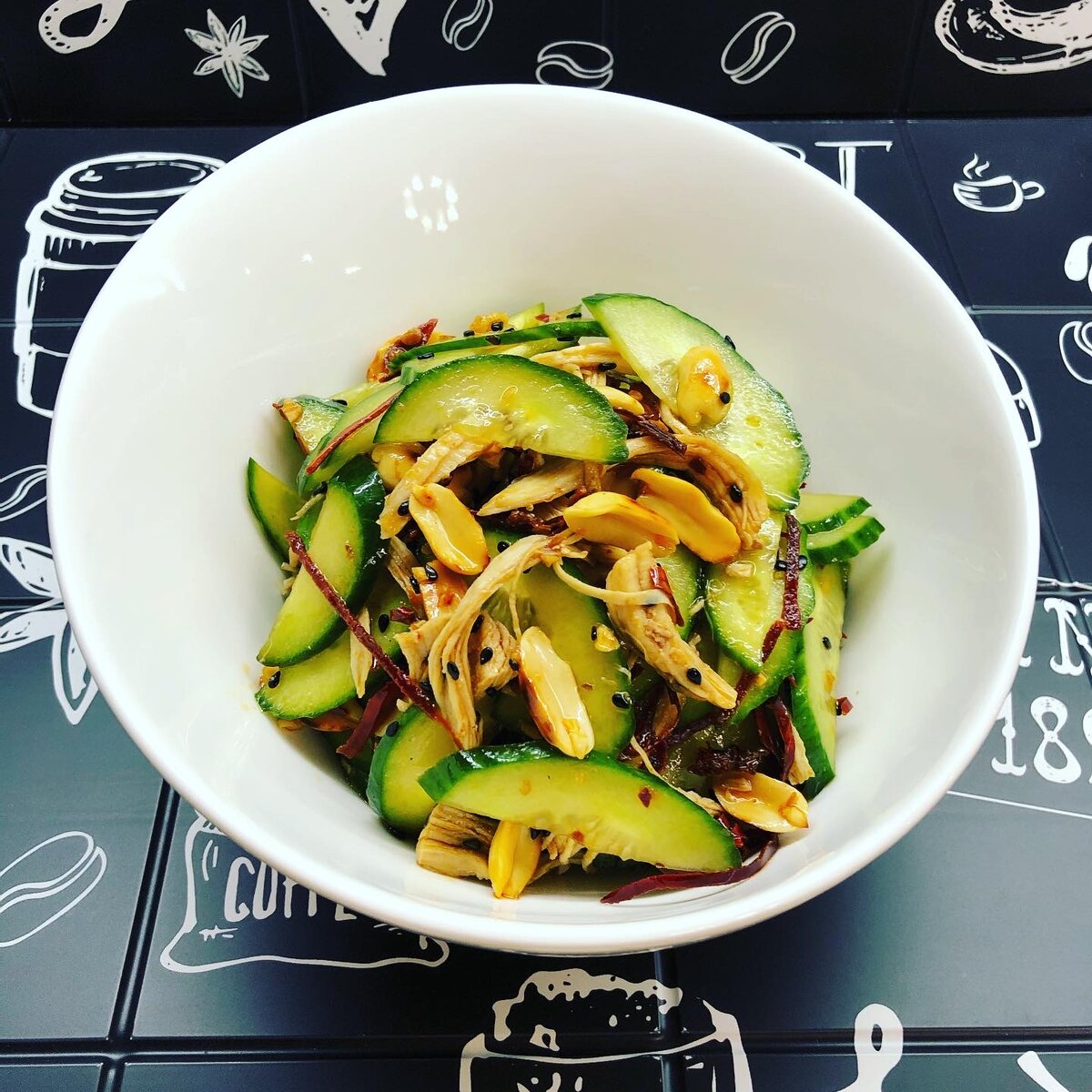Для приготовления нам понадобится: ✔️филе куриной грудки - 150г ✔️огурец свежий длинный - 2 шт. крупного размера ✔️чеснок - 3 зубчика ✔️арахис - 50г ✔️кунжут чёрный - 1 ч.л. с горкой ✔️сахар - 1 ч.л. с горкой ✔️соевый соус - 2 ст.л. ✔️масло растительное - 4 ст.л. ✔️красный перец соломкой острый - 15г ✔️соль - 1/3 ч.л. Куриную грудку отвариваем до готовности в течении 30 минут. Охлаждаем, разбираем на волокна. Огурец разрезаем пополам и нарезаем его наискосок толщиной 1-2 мм. Огурцы перекладываем в салатник, сверху выкладываем куриную грудку. Добавляем сахар и соевый соус. На сухой сковороде обжариваем арахис в течении 5-7 минут. Пересыпаем в тарелку, немного остужаем, очищаем и разделяем на половинки. Если вы используете уже жареный арахис, то сразу очищаем его и разделяем на половинки. На сковороду высыпаем очищенный арахис и кунжут, обжариваем в течении 3-5 минут. Далее добавляем растительное масло, измельчённый чеснок, все быстро перемешиваем. Добавляем острый перец, обжар