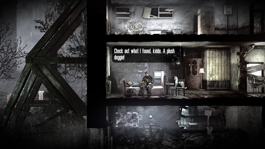 В качестве примера поделюсь одним впечатлением: во время прохождения This War of Mine я нередко ощущал как уколы совести, так и радость от возможности поступить по убеждениям. Однако финальные титры с морализаторством на тему поступков моих героев меня чудовищно разочаровали. В них не было ни правды жизни, ни той серой морали, которая предполагается сложными условиями выживания, — только благоглупости в духе «У хороших будет всё хорошо». Но мне не пять лет, чтобы в это верить, и я кое-что знаю о психологии посттравматических состояний.